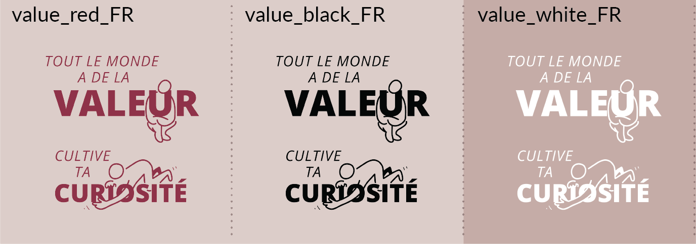 Les fichiers utilisent le modèle de nommage suivant: + trait de soulignement + . Exemple : « value_red_FR.png » indique « Tout le monde a de la valeur. Soyez curieux » en rouge. » dans la page Messages clés du document.