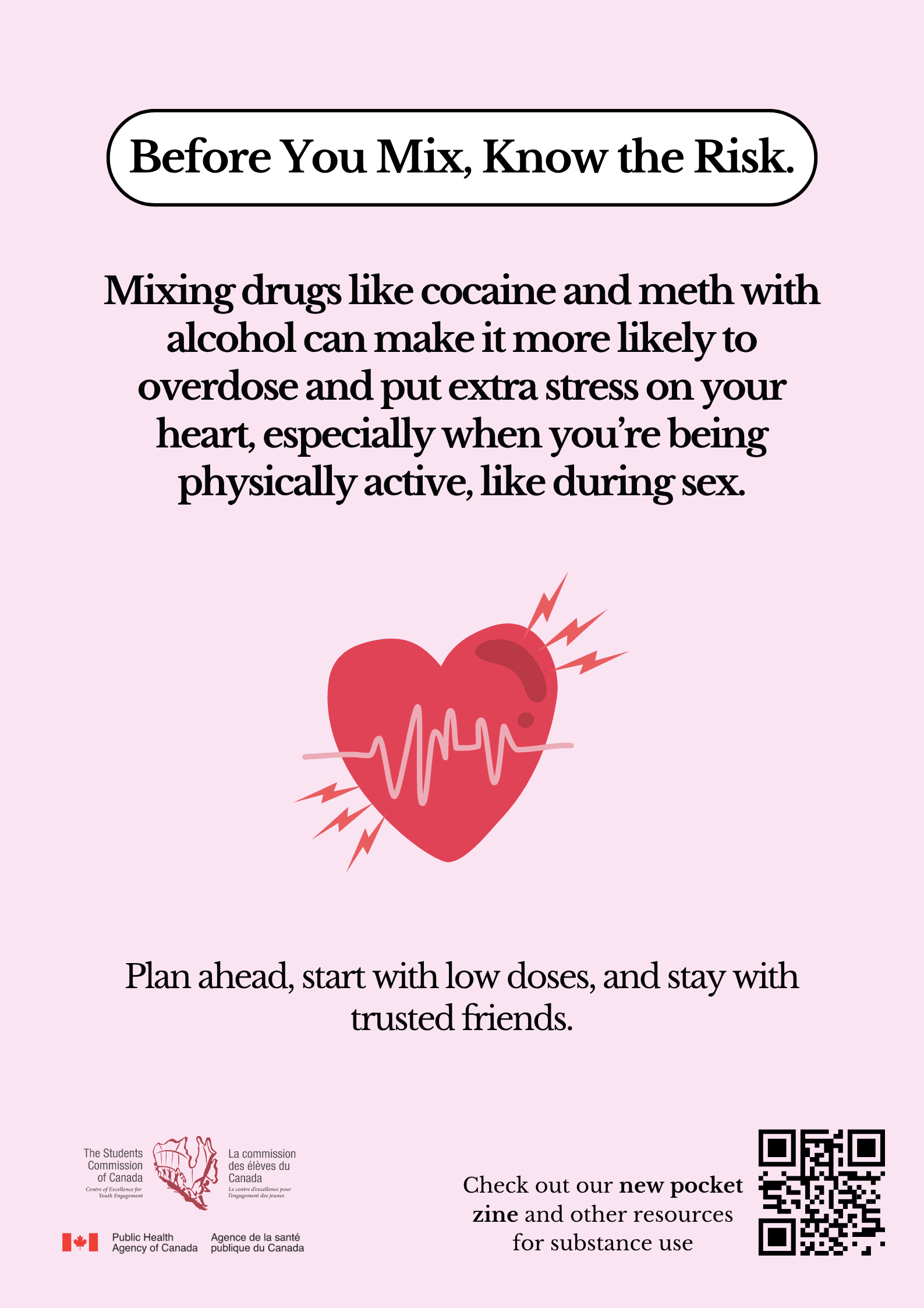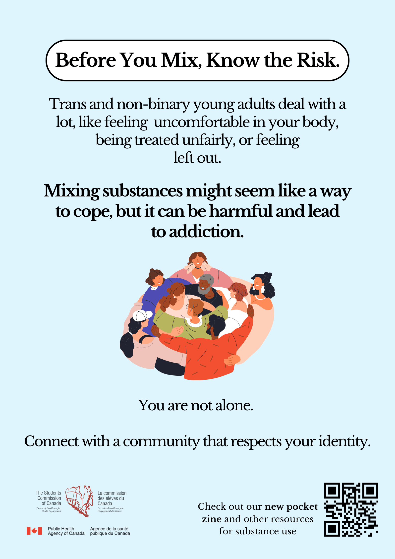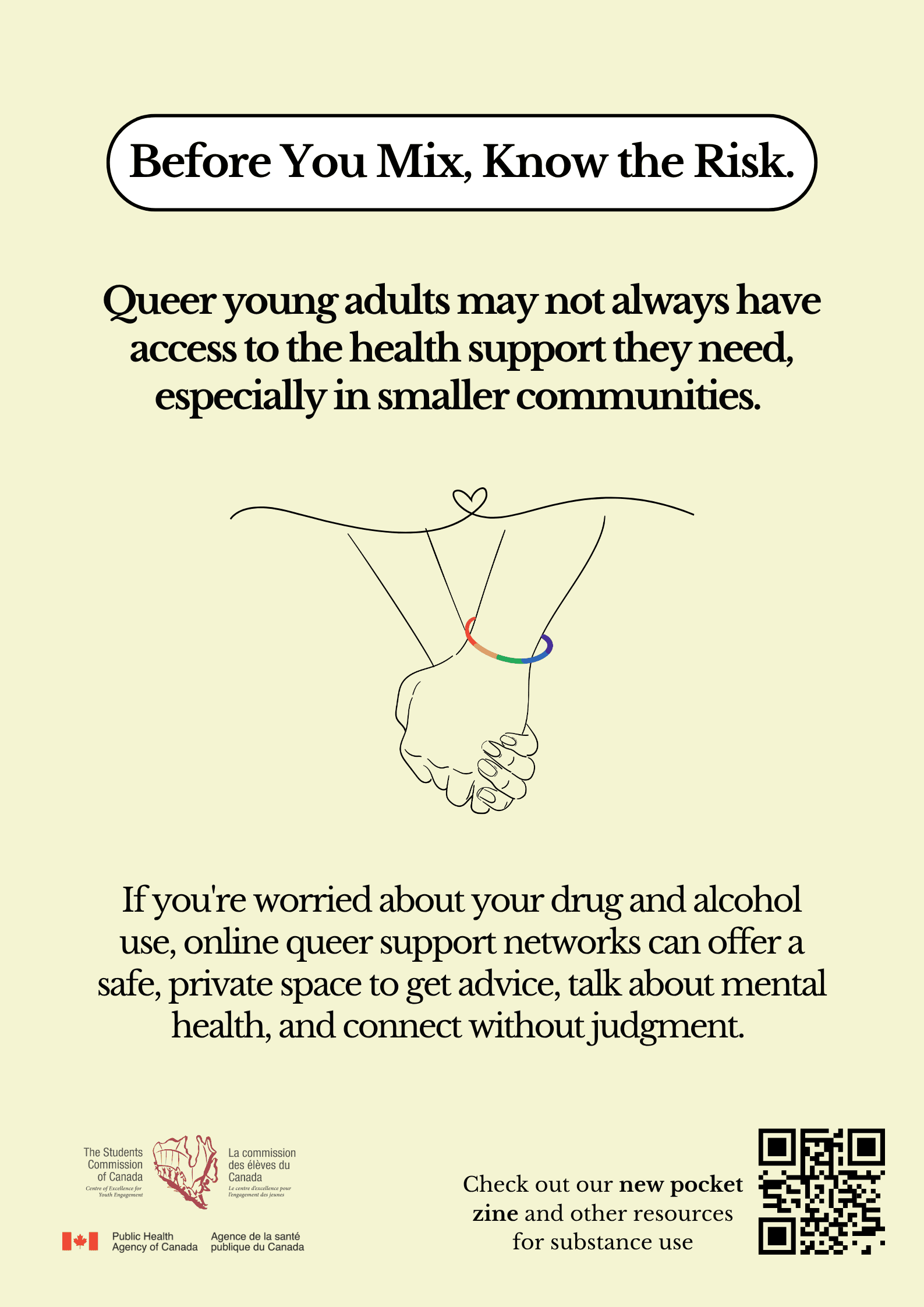 The Students Commission of Canada (SCC) was contracted by the Public Health Agency of Canada (PHAC) to develop a series of public education products designed to support sexually and gender diverse young adults in making informed, evidence-based decisions when it comes to polysubstance use (using multiples substances in the same period). These products were informed by a literature review and public consultations.