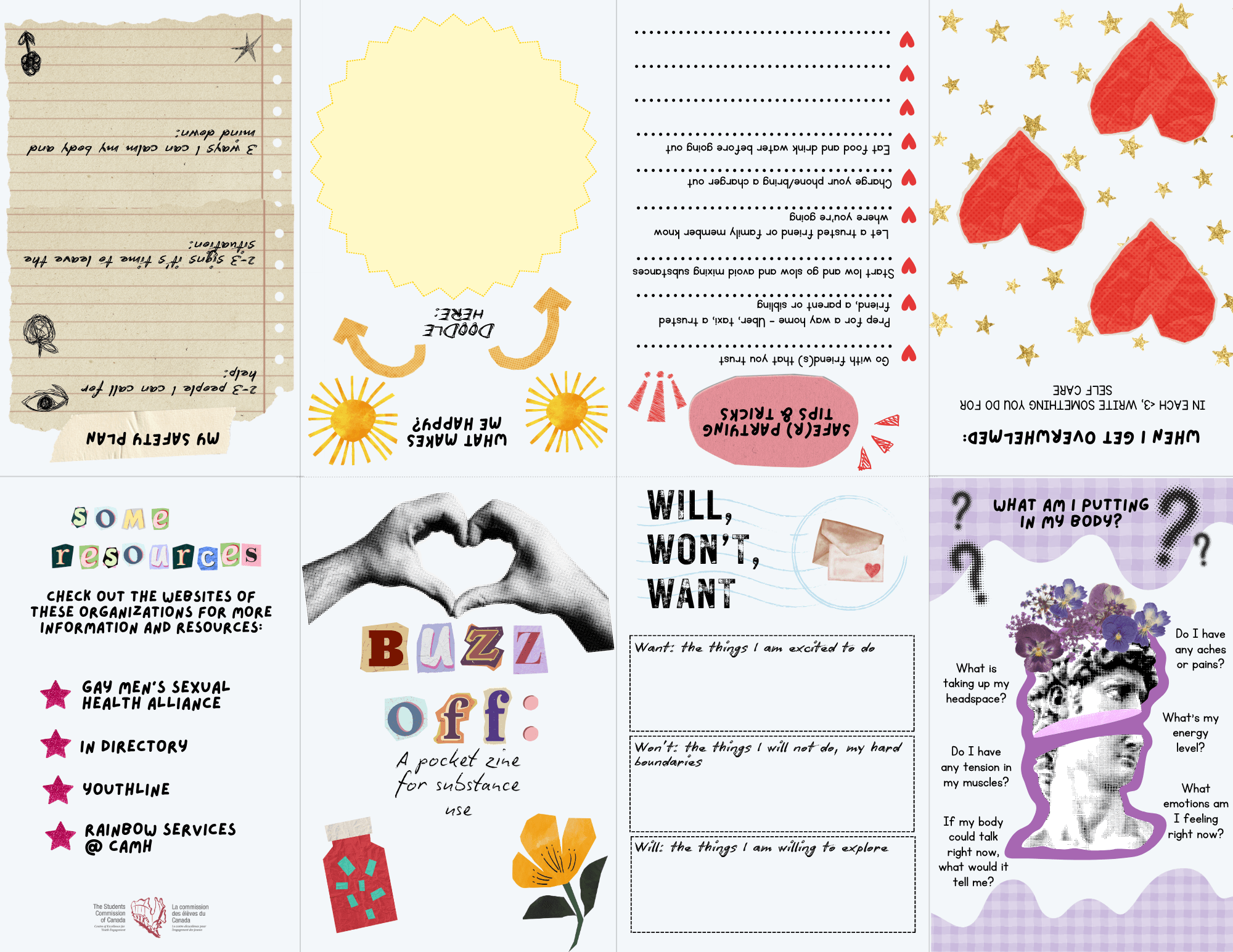 This zine was created by and for 2SLGBTQIA+ youth and young adults as a creative, personal, and accessible way to share harm reduction messages. Zines are a popular and trusted format in queer communities, offering a mix of art, storytelling, and information. Print a copy for yourself or to distribute at events, clinics, and community spaces—or share digitally to spark conversations.